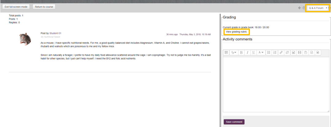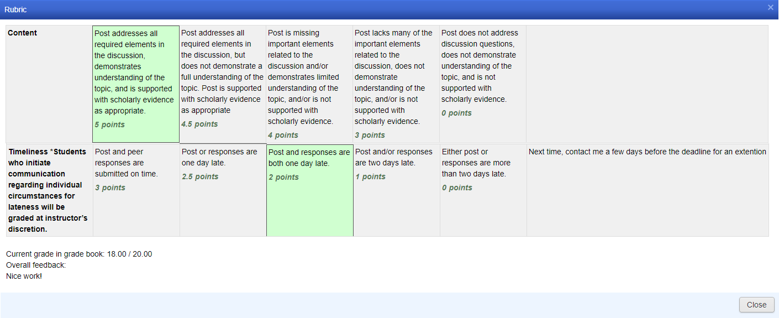 Some instructors use online rubrics to grade assignments and discussion forums. If your course utilizes rubrics, you can review your results in Open Grader.