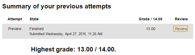 To review your results, click in the quiz that you want to review. On the introduction page of the quiz, you will see a small table with your quiz attempt information. Click Review to review the quiz and your results.